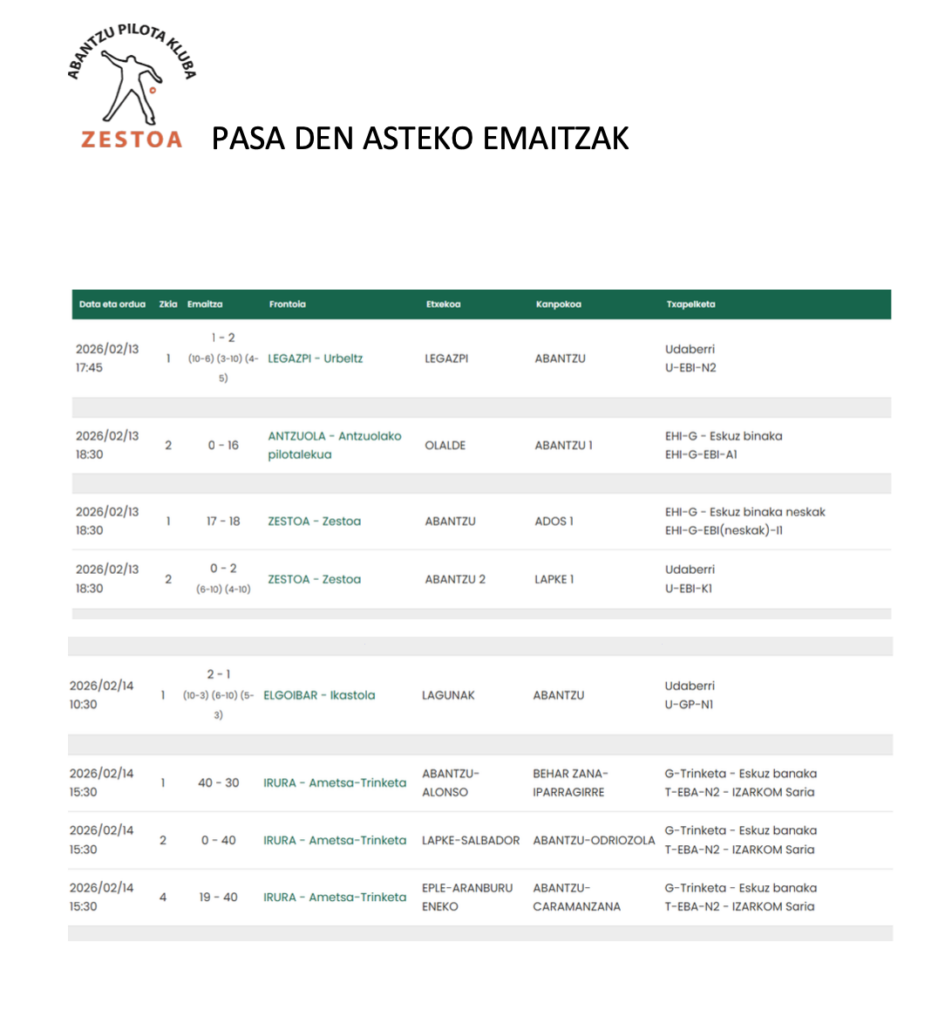 Abantzu Pilota Klubeko emaitzak eta asteburuko partidak
