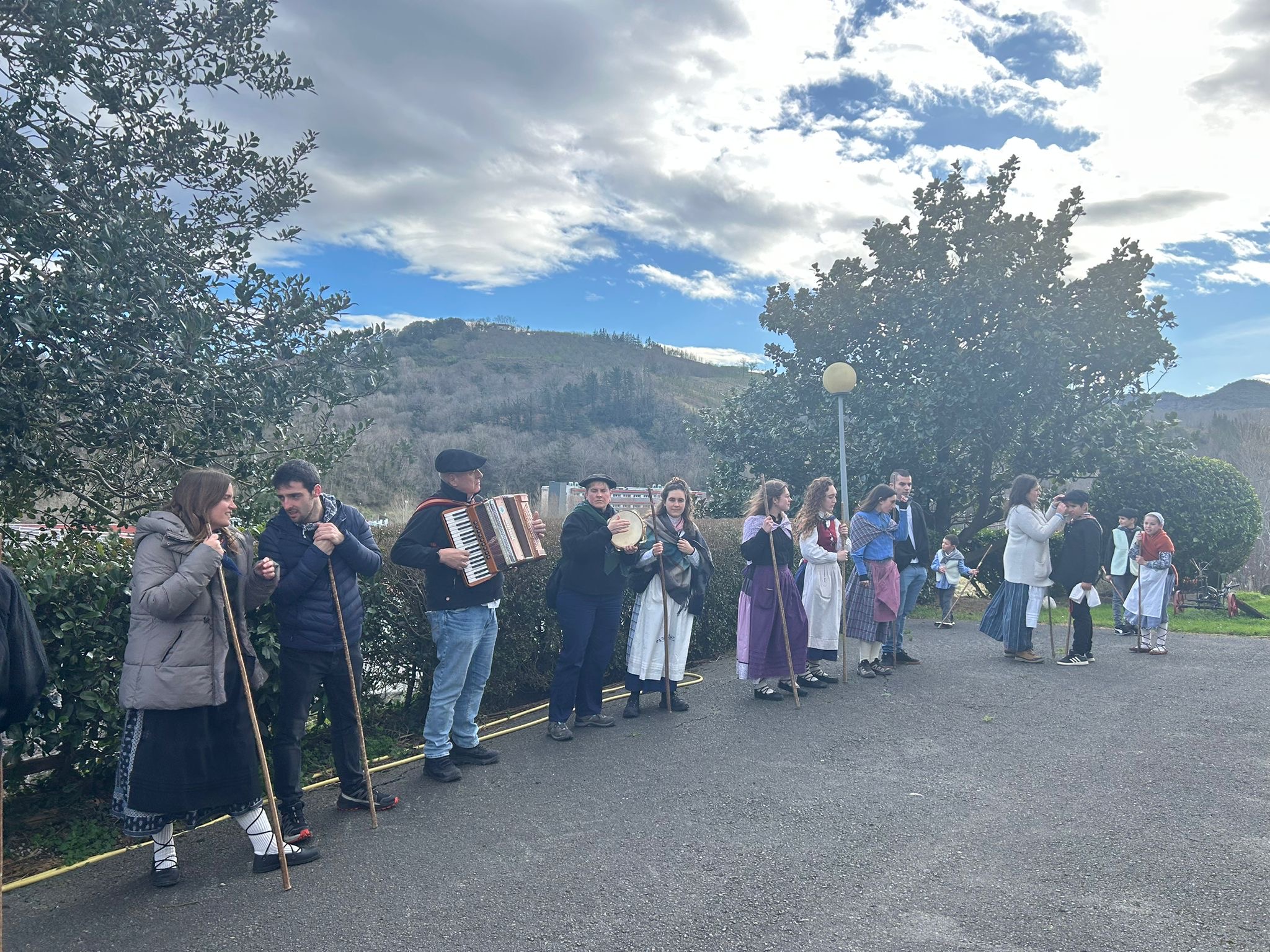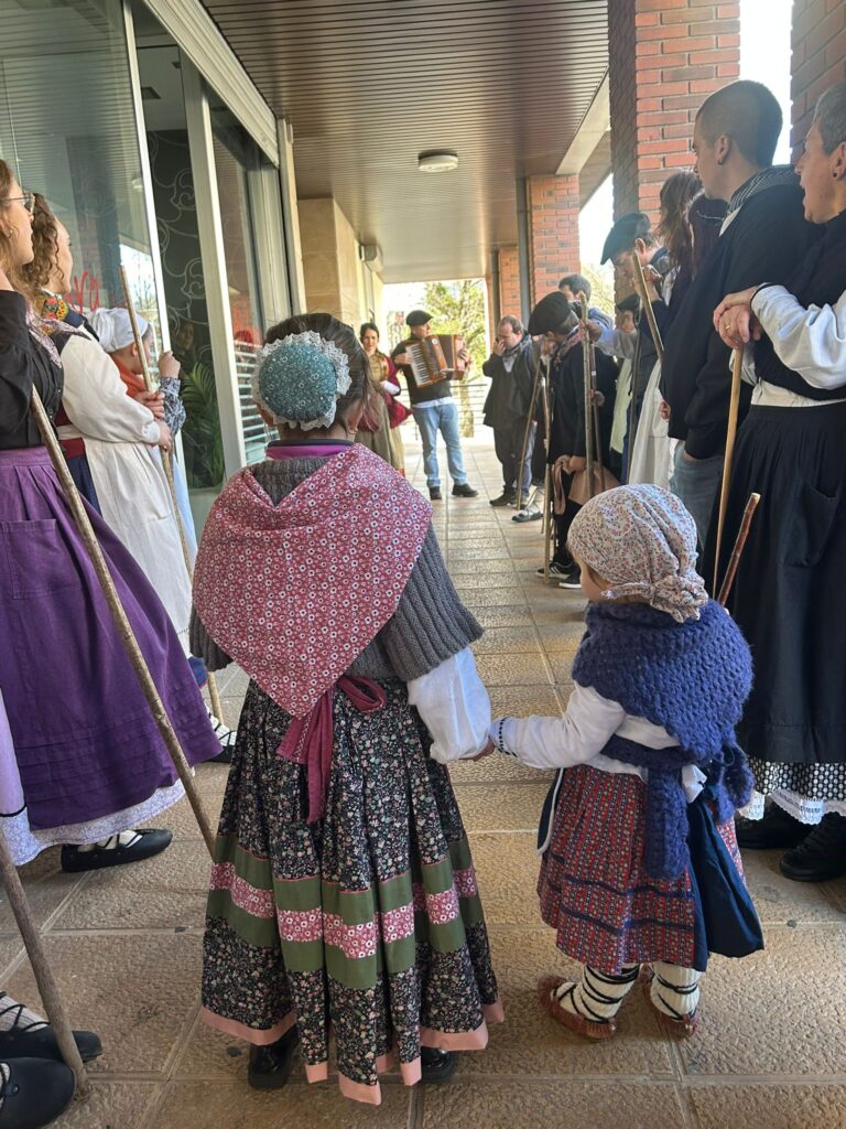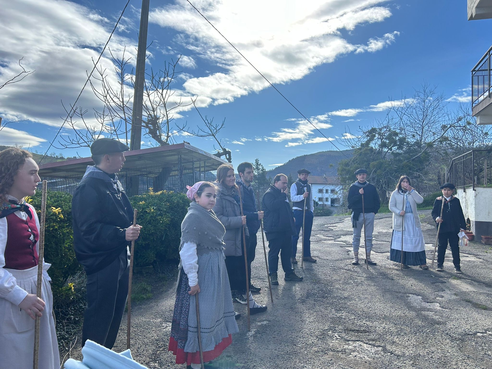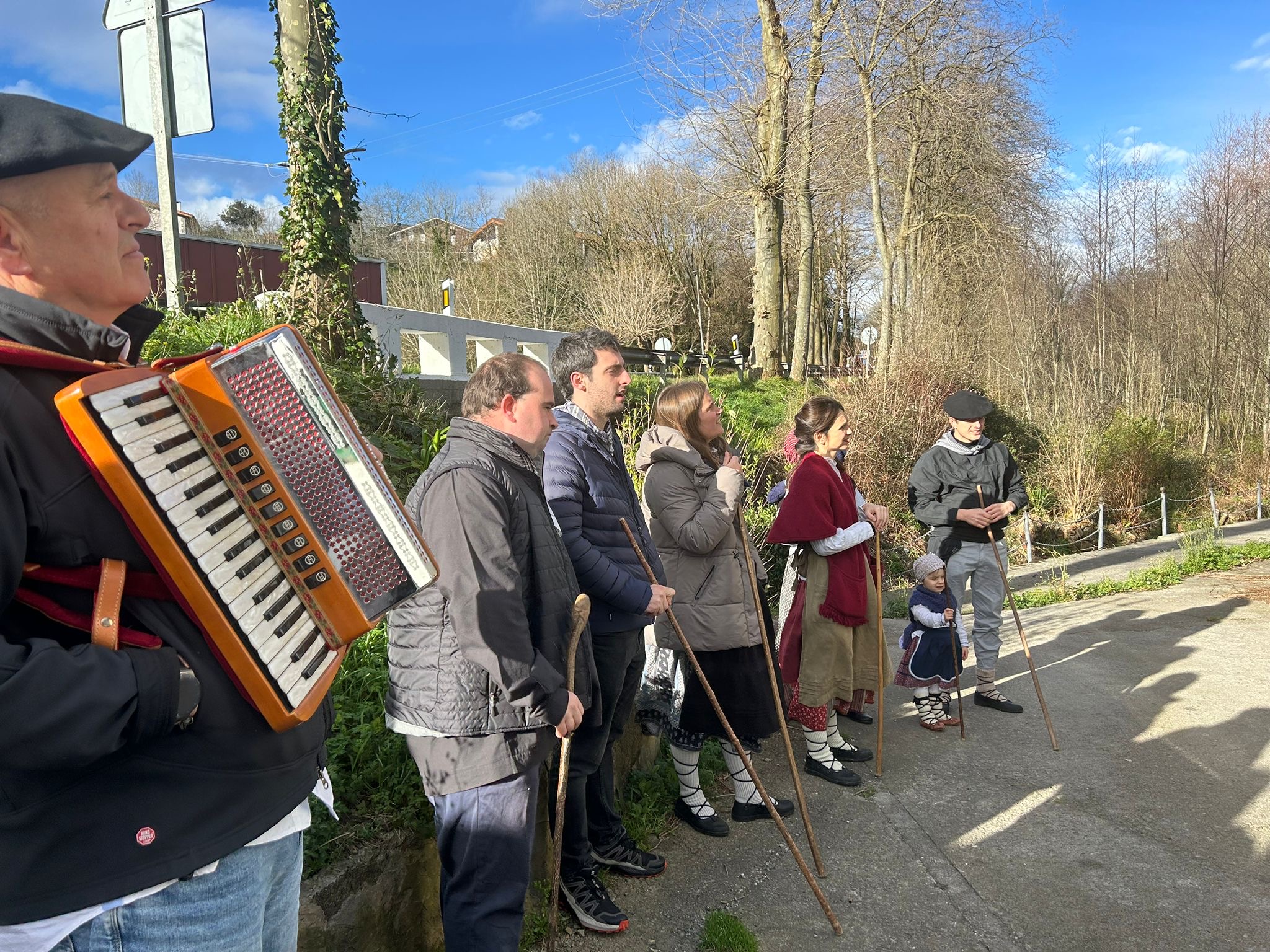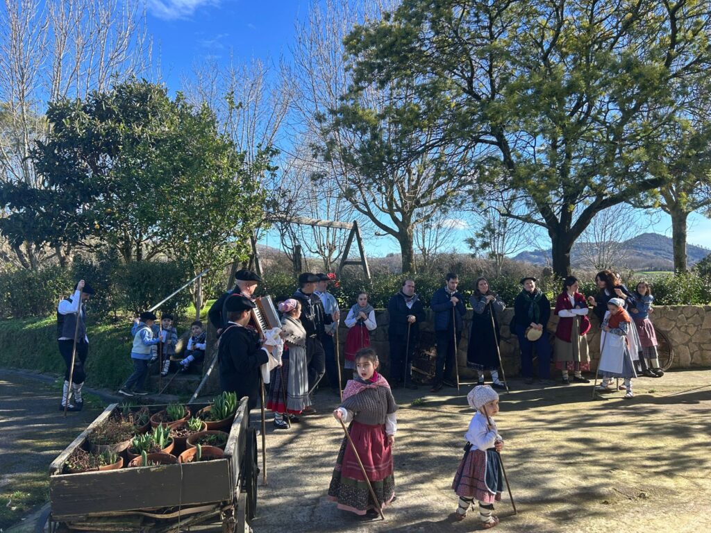 Arroabean ez dute kale egin Santa Agedako ospakizunetan. Lurra astinduz ekin diote zapatuari, izan ere, 10:00etan hasita, auzoko baserri eta etxeetan barrena ibili dira, makilak eskuan hartuta kopla kantari. Giro eguzkitsua lagun, trikitilarien eta Eneritz Artetxe zein Xabat Illarregi bertsolarien laguntzarekin goiza eman ondoren, eguerdian dilista-jana egin dute elkartean. Behin indarrak hartuta, arratsaldean eskean jarraituko dute.