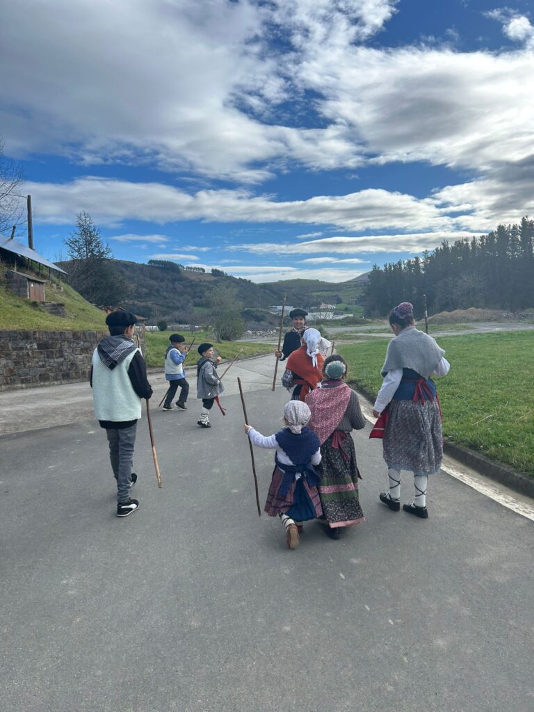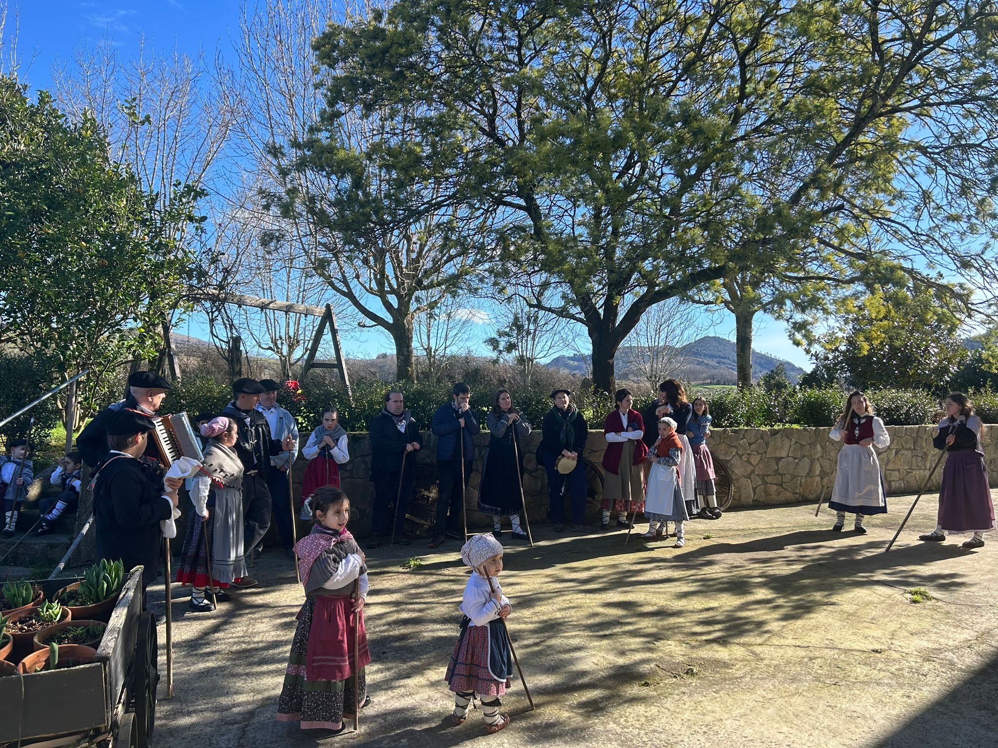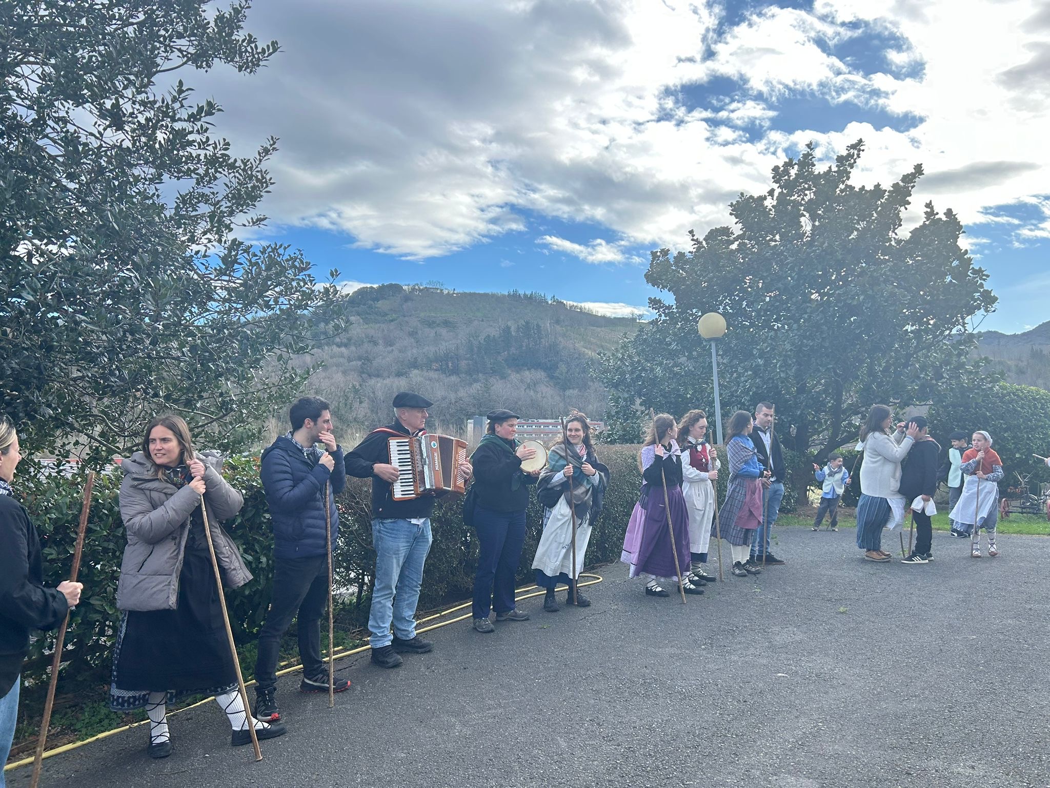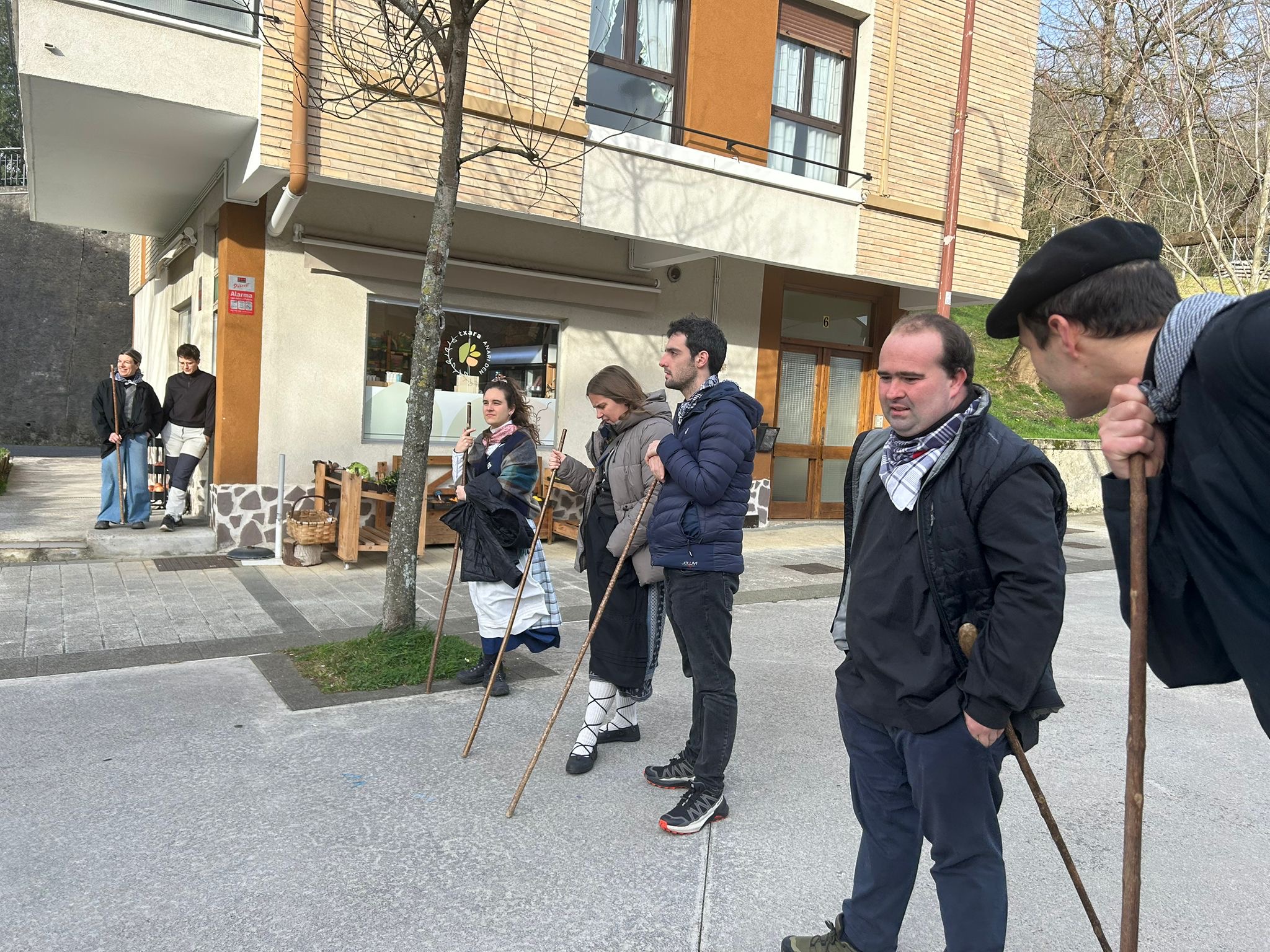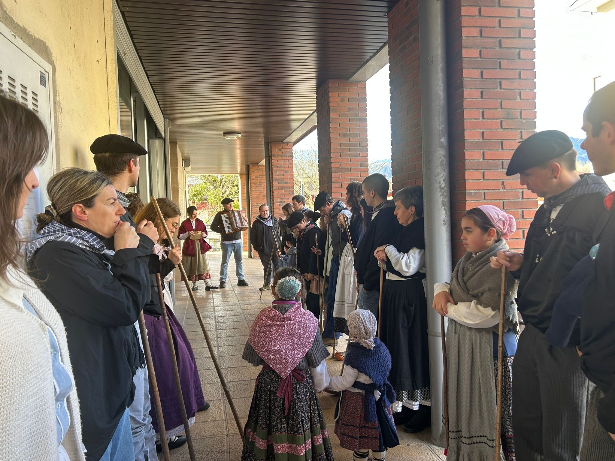 Arroabean ez dute kale egin Santa Agedako ospakizunetan. Lurra astinduz ekin diote zapatuari, izan ere, 10:00etan hasita, auzoko baserri eta etxeetan barrena ibili dira, makilak eskuan hartuta kopla kantari. Giro eguzkitsua lagun, trikitilarien eta Eneritz Artetxe zein Xabat Illarregi bertsolarien laguntzarekin goiza eman ondoren, eguerdian dilista-jana egin dute elkartean. Behin indarrak hartuta, arratsaldean eskean jarraituko dute.