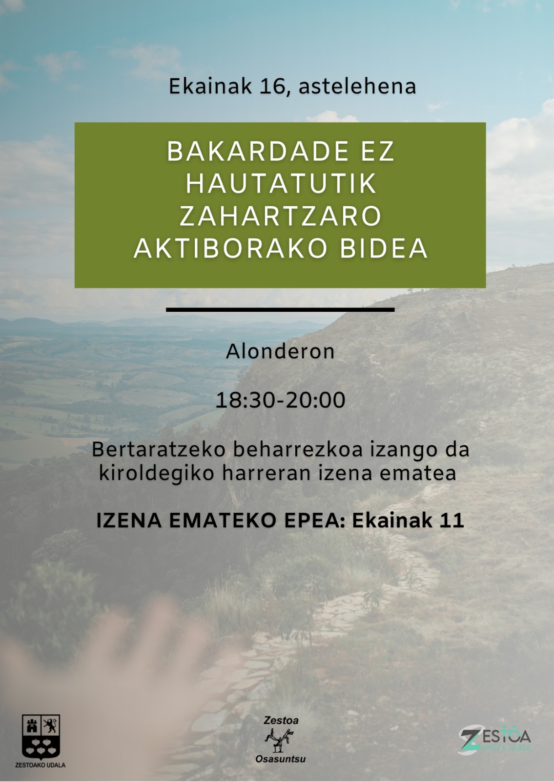 Arratsaldeko 18:30etatik 20:00ak bitarte Zestoa Osasuntsutik antolatutako “Bakardade ez hautatutik zahartzaro aktiborako bidea” deitutako hitzaldia egingo da, Zestoako Alondero aretoan. Hitzaldira bertaratzeko, beharrezkoa izango da ekainaren 11 aurretik Zestoako kiroldegian izena ematea