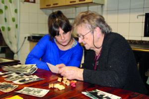 Amaiur Aristi eta Begoña Eizagirre Konpitteroneko sukaldean, argazki zaharrei begira.