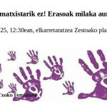 Azaroak 25a Emakumeenganako Indarkeriaren Aurkako Nazioarteko Eguna izanik, betaurreko moreak janzteko unea da. Hots, emakume guztiek egunero jasaten dituzten indarkeria mota guztiak inoiz baino ozenago eta elkartuago salatzeko eguna. Biktima izan diren, gaur egun diren eta etorkizunean izango direnei indarra emanez eta elkartasuna adieraziz, Zestoako Udalak bat egiten du Zestoako Txoko Feministak larunbatean 12:30 plazan gauzatuko duen elkarteratzearekin. Era berean, laister abian jarriko da autodefentsa tailer bat herrian bertan. Azkenik, ez dezagun ahaztu: Ez beti da EZ!